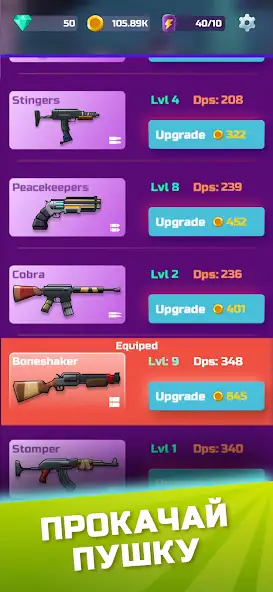 - Использование оружия: пистолетов, снайперских винтовок и прочего. Арсенал можно улучшать в обмен на монеты.
