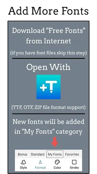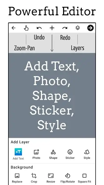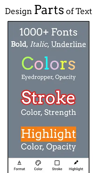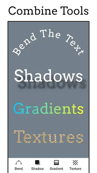 Можно загружать пользовательские шрифты, выбирать разные стили для отдельных частей текстовой информации, использовать градиенты, изгибы, тени, текстуры. Присутствуют функции повтора, отмены, изменения прозрачности букв, позиционирования, обрезки. Доступны инструменты для отражения, поворота, замены, изменения размеров и формы, заполнения фона, например, цветом, фотографией. В приложении «Добавить текст на фото» есть реклама.