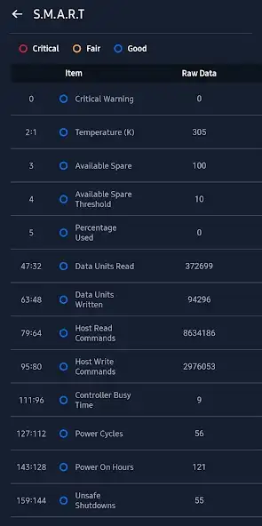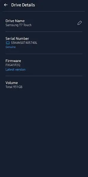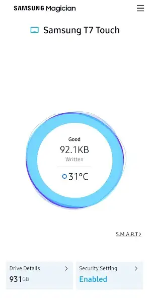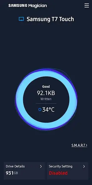 Присутствует интерфейс на русском языке, светлый и темный режимы. Можно включать, отключать функцию безопасности. Доступна настройка пароля. Возможны проверка состояния SSD, просмотр SMART-параметров: количества часов включения, критических предупреждений; числа небезопасных отключений, рабочих циклов; единиц написанных данных и других. Есть уведомления о появлении обновлений программы. Модель T7 Touch поддерживает настройку и изменение отпечатка пальца.