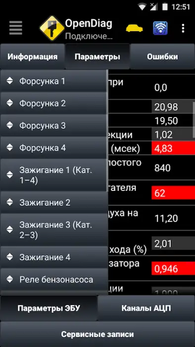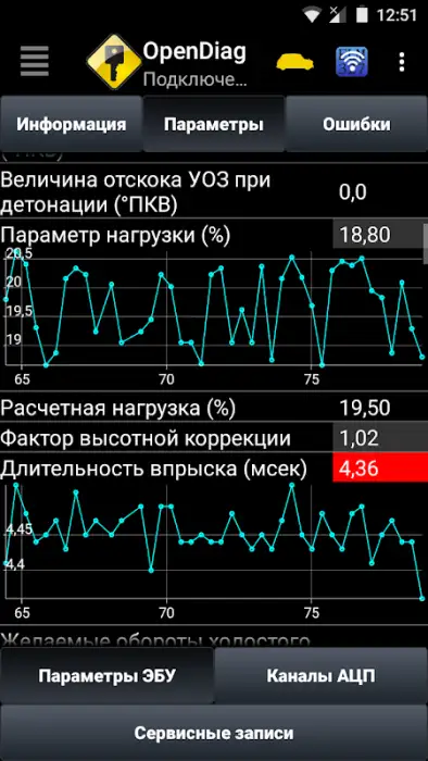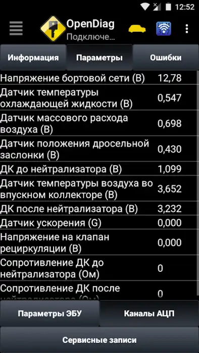 Приложение OpenDiag доступно в темной теме. Есть интерфейс на русском языке, вкладки: «Информация», «Параметры», «Ошибки». Присутствует демонстрационный режим. Имеются платный контент, оповещения о необходимости его активации. Наличие активированных узлов на одном устройстве позволяет включать их для дополнительных двух аппаратов без совершения повторных покупок. Можно смотреть напряжение батареи, обороты двигателя и другие данные.