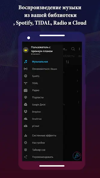 Boom — плеер со встроенными басами, эквалайзером для прослушивания музыки. Присутствуют реклама, русскоязычный интерфейс, 3D-звук. Возможно прослушивание песен со стриминговых сервисов TIDAL, Spotify, Deezer, из облачных хранилищ Dropbox, Google Drive, pCloud, памяти устройства. Можно воспроизводить аудиозаписи высокой частоты дискретизации. Присутствует поддержка Android Auto. Есть таймер сна, кнопка «Порекомендовать», функции поиска, изменения интенсивности звука.