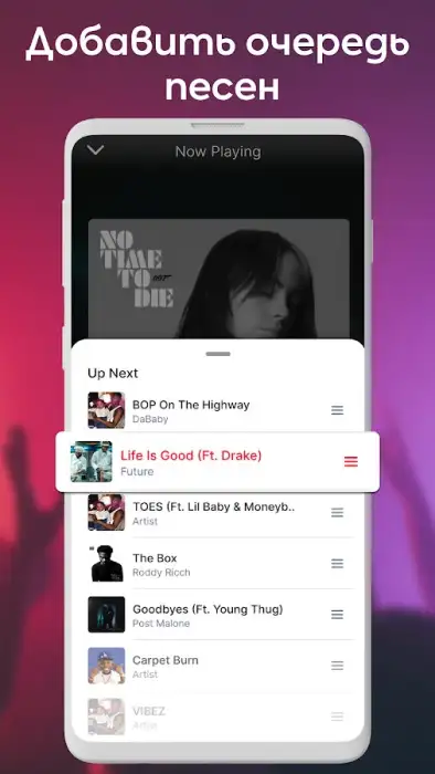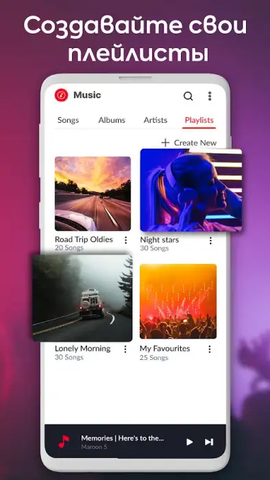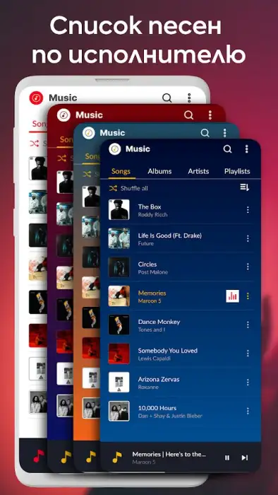 Материалы сканируются автоматически, классифицируются по альбомам, исполнителям, названиям. Приложение «Музыкальный плеер» доступно в светлой, темной и прочих темах. Есть возможность блокировать экран воспроизведения, чтобы приостанавливать прослушивание контента без открытия приложения. Возможно: создавать список избранных материалов, добавлять композиции в очередь, смотреть, кто поет.