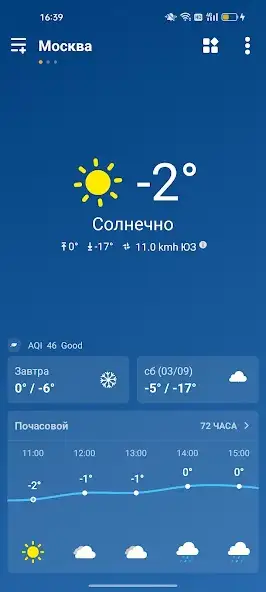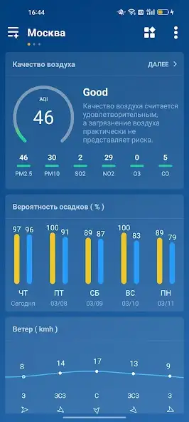 Присутствует русскоязычный интерфейс. Есть темная тема, реклама, ежедневный индекс здоровья и жизни. Информация определяется автоматически при смене местоположения с помощью данных GPS или Сети. Можно включать, отключать уведомления, использовать радар, отслеживать погоду в двух и более локациях. Доступен выбор источника информации, например AccuWeather. Имеются карта землетрясений и графики.