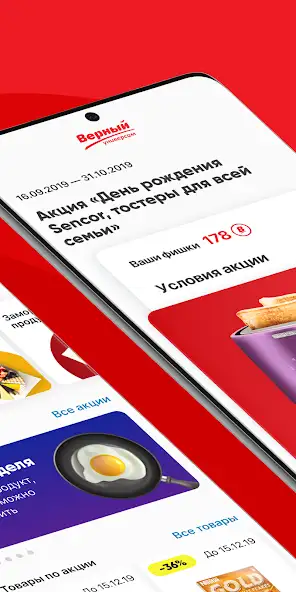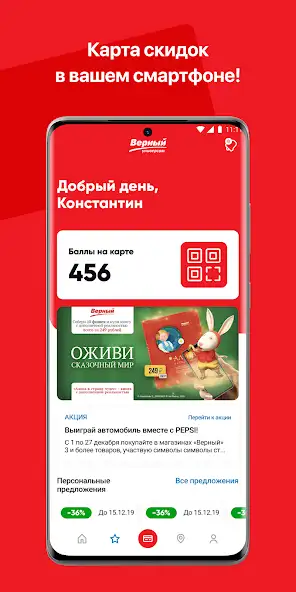 Верный — личный кабинет покупателя от одноименной торговой сети для использования программы лояльности при покупке товаров. Можно просматривать чеки, доступные акции и предложения, добавлять продукцию в избранное, отслеживать баланс дисконтной карточки, историю приобретений. Для начисления или списания бонусных баллов необходимо показать QR-код на кассе. Присутствует встроенная карта с указанием адресов магазинов. Контент представлен в виде списка миниатюр и разделен на категории.