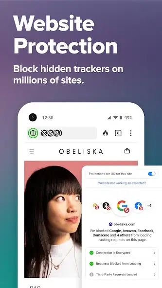 DuckDuckGo — браузер для открытия веб-страниц с уникальной системой защиты. Имеет собственный поисковик, который скрывает личные данные людей от хакеров, мошенников и торговых компаний. Закрывает доступ к рекламным трекерам, куки-файлам, истории поиска, отслеживанию местоположения. Имеет свою рекламу, блокирует сторонние окна, баннеры.