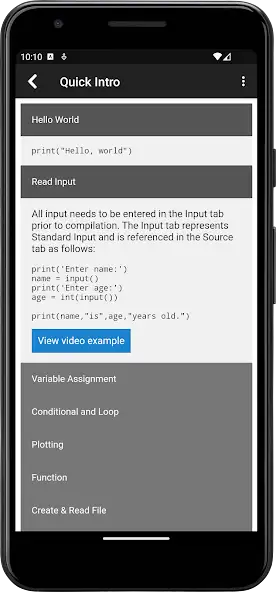 Есть языковой справочник, руководство по использованию приложения с видеопримерами, встроенный поиск, редактор исходного кода, где возможно выделять строку, настраивать размер шрифта, подсветку синтаксиса и другие параметры. Интерактивные программы недоступны. Для компиляции необходимо подключение к Сети. Присутствует платная подписка с автопродлением, которая поддерживает обновление пакетов и отключает рекламу.