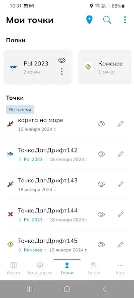 Возможно создавать, копировать, переименовывать, сохранять точки, импортировать или экспортировать их в GPX-формате, делиться через Интернет. Можно прокладывать маршрут к выбранному месту, накладывать структурные схемы отдельных участков на план глубины. Имеется выбор регионов, иконок для точек, список созданных элементов, кнопки увеличения, уменьшения масштаба. Язык интерфейса русский.