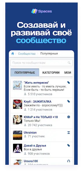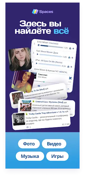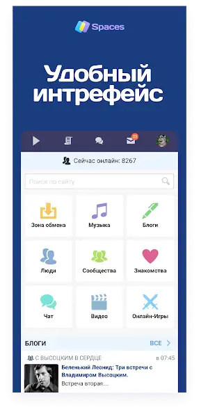 Spaces – социальная сеть для знакомства и общения пользователей. Главная страница содержит «Музыку», «Сообщества», «Видео» и прочие пункты меню. Без регистрации использовать программу невозможно. В разделе «Зона обмена» можно отправлять и получать от других юзеров книги, фото, ролики и иные файлы.