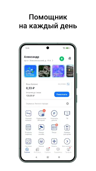 Интерсвязь — личный кабинет для приема видеовызовов, открытия двери подъездов без ключа, просмотра трансляций с камеры «умного» домофона и записей из архива, управления услугами. Можно включать, выключать интернет по расписанию. Доступен просмотр контента с телевизионных каналов, детализации счета. Присутствуют светлая тема, русскоязычный интерфейс. Есть проверка статуса Сети, круглосуточная техническая поддержка, чат-бот Ева, возможность заказа службы сервиса с выездом на дом.