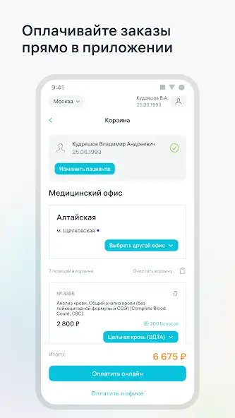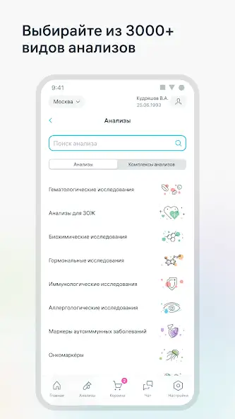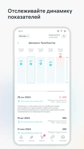 Присутствует информация о лабораторных тестах, границах нормы и причинах отклонения от них, актуальных ценах, акциях, другая. Есть возможность мониторинга динамики показателей с помощью графика результатов исследований, вызова бригады для взятия биоматериала на дому. Доступна встроенная карта, прокладывающая маршрут к более 1800 медицинским офисам с описанием режима работы, услуг, прочих сведений. Позвонить в выбранную лабораторию можно из меню приложения. Возможно начисление бонусных рублей, кешбэк, применение купонов.